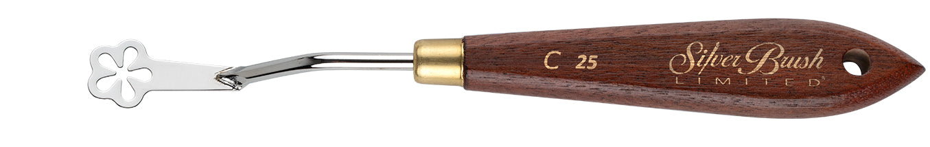 Crafted with high-quality carbon steel, the Silver Brush Ltd Creative palette knife # C 25 is a versatile tool for artists working with oil, acrylic, impasto, gesso and all paints. The flexible, uniquely shaped blade is designed to create a variety of unique patterns and intricate details. Great for fabric, wallpaper and textile patterns on any surface. The ergonomic handle provides a comfortable and secure grip, allowing for precise control and a seamless painting experience. A must-have for both professional and aspiring artists, this knife is a durable and reliable addition to any creative toolkit.